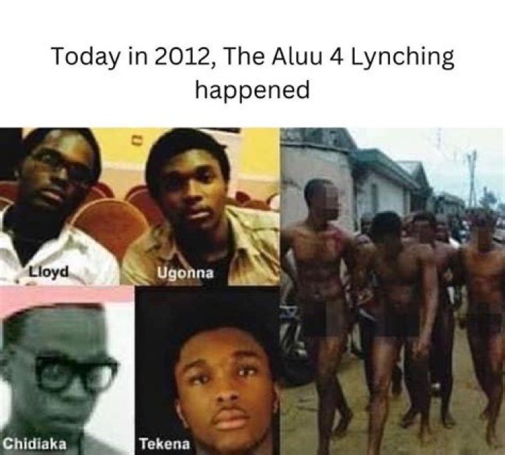 Aluu 4 Killers refers to the gruesome murder of four young men in Aluu, a town in Rivers State, Nigeria, on October 5, 2012. The victims, Ugonna Obuzor, Toku Lloyd, Chiadika Biringa, and Tekena Elkanah, were falsely accused of theft and brutally beaten and burned to death by a mob.